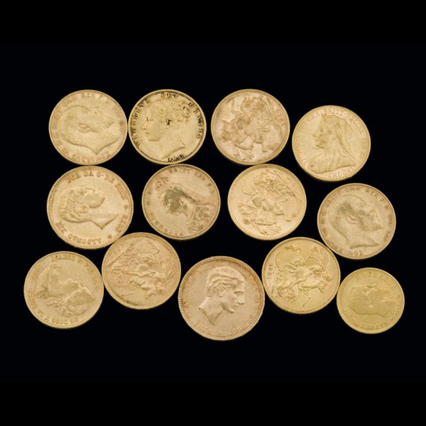 Lote de monedas de oro formada por: nueve monedas de libra inglesa, dos monedas de 25 pesetas Alfonso XII, moneda 100 reales Isabel II, moneda de 10 francos franceses.