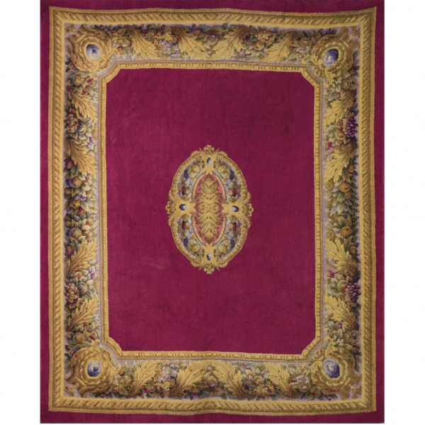Gran alfombra en nudo español de la Real Fábrica de Tapices. Campo en color granate con cenefa y medallón central de motivos vegetales, frutos y acantos, en colores azules, dorados y verdes.