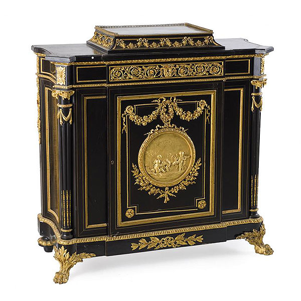 Con aplicaciones de bronce dorado al mercurio. Frente con puerta central. Ricamente decorado con guirnaldas florales y laureadas, y cenefas vegetales. Tondo con escena de puttis en la puerta, flanqueada por dos columnas jónicas. Perfiles con perlados y fileteados. Patas en garra. Estampillado en diferentes zonas. Con llave. Francia, circa 1870.