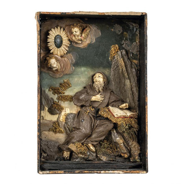 ESCUELA ITALIANA S. XVIII "Santo eremita". Escaparate realizado en cera tallada y policromada. Muestra un santo eremita ante la aparición del Espíritu Santo. Pudiéndose tratar de San Antonio Abad. Algunas faltas puntuales como los dedos de la mano izquierda del santo y un cordón del cíngulo.