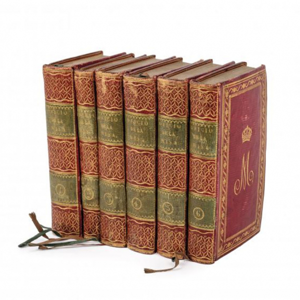 Ejemplar que perteneció a la Reina María Cristina.- "MISAS DE LAS FESTIVIDADES SEGÚN EL RITUAL ROMANO, á que asiste su magestad (que Dios Guarde) en su Real Capilla a la cortina, para uso de los Excmos. Sres. Grandes de España" M.: Imprenta de la Real Compañía, 1817.