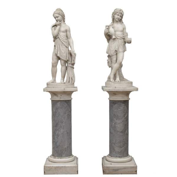 ESCUELA ITALIANA O FRANCESA S. XIX "Verano y Otoño". Pareja de grandes esculturas realizadas en mármol blanco tallado y pulido. Muestran a la personificación de las estaciones de Verano y Otoño a la manera tradicional, con los atributos correspondientes a la siega y a la vendimia. Ambas sin firma visible.