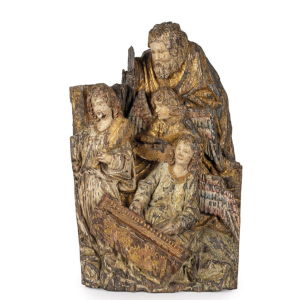 Muestra a tres ángeles músicos tocando, reconocibles, un laud y un virginal. Tras estos un personaje anciano y barbado que recuerda a San Pedro. Faltas en la policromía y dorado debido al paso del tiempo. Bonita pátina. 50 x 17 x 30 cm