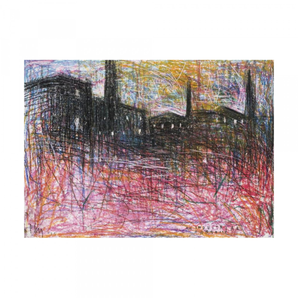 "An industrial paradise (2009)". Texnica mixta y grattage sobre papel. Firmado y fechado (009) en el ángulo inferior izquierdo.