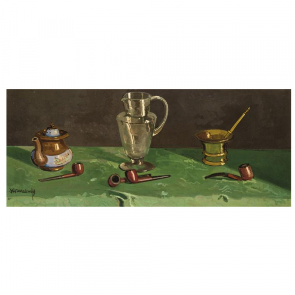 "Bodegón de pipas". Óleo sobre tabla. Firmado en el ángulo inferior izquierdo.
