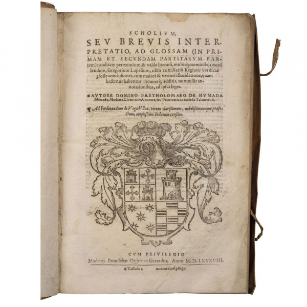 "SCHOLIUM, seu brevis interpretatio ad glossam (in primam et secundam partitarum partem) conditam per eximium & valde literatu..." Madritij: Quirinus Gerardus, 1588.