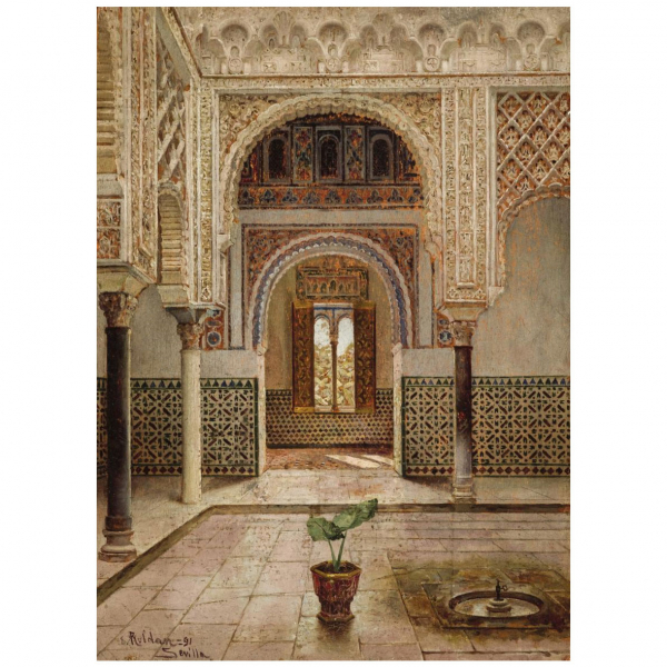 "Reales Alcázares de Sevilla". Óleo sobre tabla. Firmado, localizado (Sevilla) y fechado (91)