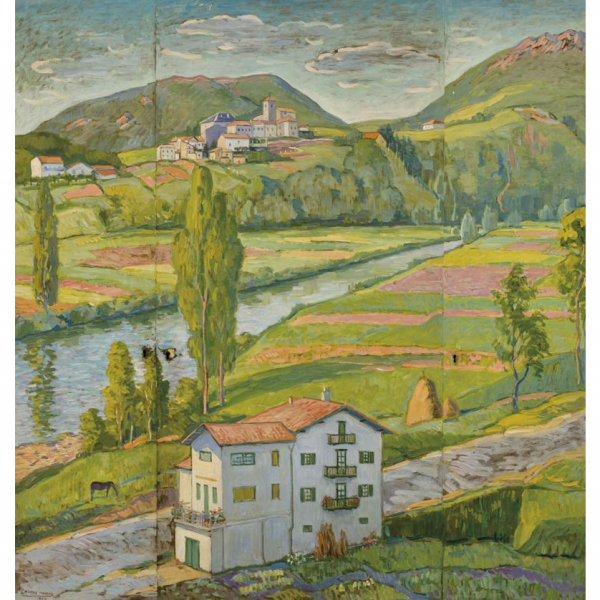 "Casas junto al río (1964)". Tres puertas de madera pintadas al óleo. Firmadas y fechadas (1964) en el ángulo inferior izquierdo del panel izquierdo.