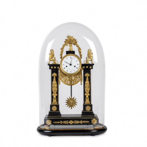 Sofisticado reloj de sobremesa época Consulado/Imperio estilo Retour d’Egypte. . Esfera en porcelana blanca con numeración romana esmaltada. Maquinaria de tipo Paris, con péndulo. Decoración de motivos egipcios como caríatides, grifos y telón central con mascarón femenino. Copete con guirnalda vegetal y bouquet. Leves faltas en la parte inferior del mármol. Plinto y dos pilastras que soportan la caja. En fanal de cristal con peana de madera. Francia, circa 1799 - 1815.