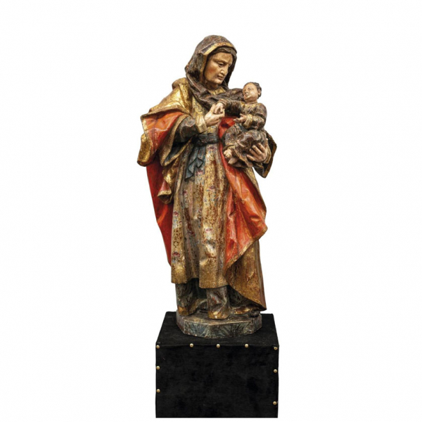 Repintes y redorados de época posterior. Sobre peana en madera tapizada en color negro y tachueleada. Recuerda a algunos trabajos de Juan Martinez Montañés. 108 cm de alto. 65 x 40 x 44 cm la peana.