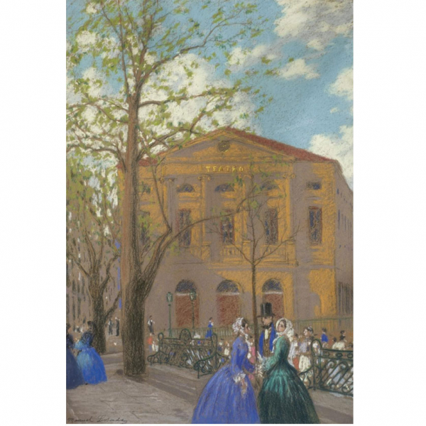 "Junto al teatro". Gouache sobre papel. Firmado en el ángulo inferior izquierdo.
