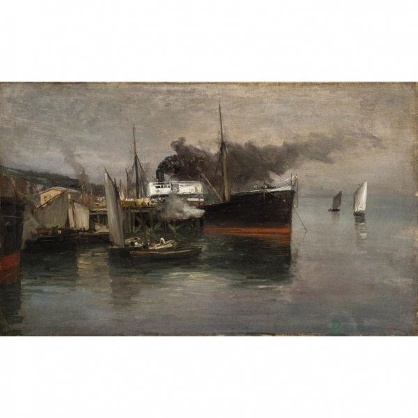 "Puerto". Óleo sobre lienzo. Firmado en el ángulo inferior derecho.