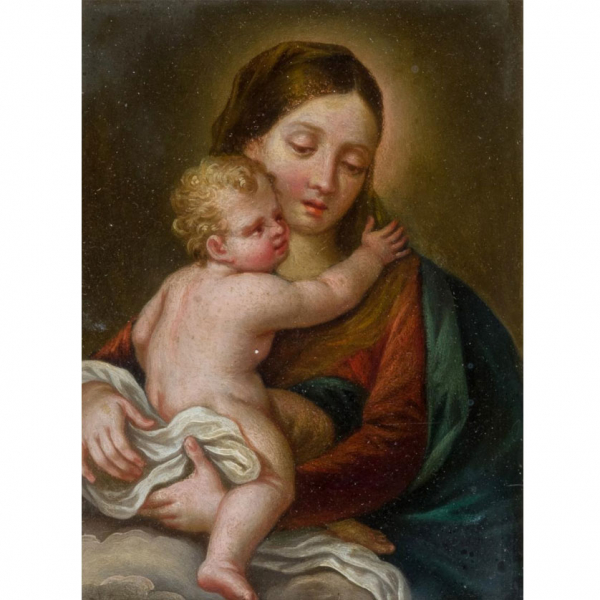 "Virgen con el Niño". Óleo sobre cobre. Firmado en el ángulo inferior izquierdo.