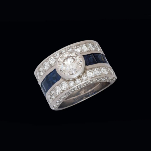 Anillo de oro blanco de 18 K. con brillante central de 1,49 cts. engastado en chatón, zafiros azules calibrados (0,95 cts.)