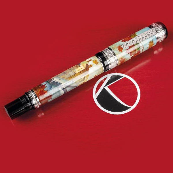 Estilográfica marca KYNSEY, modelo Autum (Otoño), realizada en técnica de pintura miniaturista rusa por "Natroyka. Plumín de oro de 18 K.