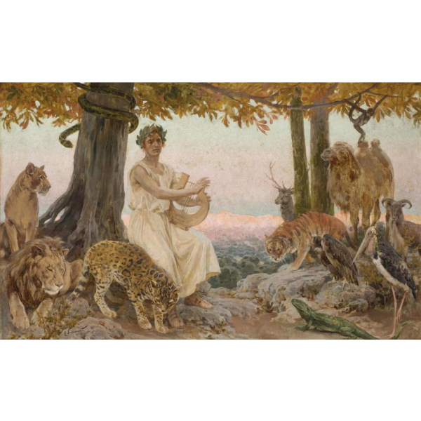 Enrique Simonet. "Orfeo amansa a las fieras". Óleo sobre lienzo. Firmado en el ángulo inferior izquierdo.