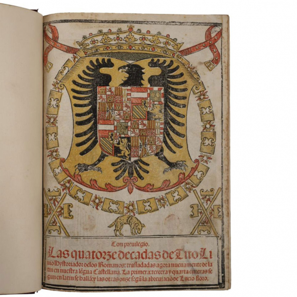 La primera: tercera y quarta enteras según en latín se hallan: y las otras onze según la avreviación de LUcio Floro" [Colofón] imprimidas en la noble y cesarea ciudad de Çaragoça: por industria y espensas de experto varón George Coci Alemán de nación y morador en la dicha ciudad. Acabaronse a veynte y quatro días del mes de mayo año de mil quinientos y veynte. Folio, plena piel, filetes en los planos; hierros y nervios en la lomera. Cortes dorados. Guardas en seda; guarda anterior en perg. rogulado "La Cámara del libro de Barcelona a su Presidente Honorario Don Gustavo Gili, gran editor, bibliófilo, eminente animador dela vida corporativa. Barcelona, Enero 1935" Firmado H. Alsina. Enc. Firmada Brugalla. Estuche de petaca. 12 h. + 533 fls. num. + 1 h. Port. a cuatro tintas. Abundantes grabados sobre madera. Antiguas inscripciones en el colofón. Salvá num. 2786.