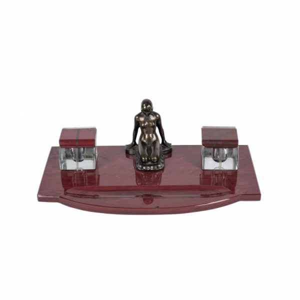 Escribanía Art Decó realizada en pasta vítrea de color granate simulando piedra. Circa 1920.