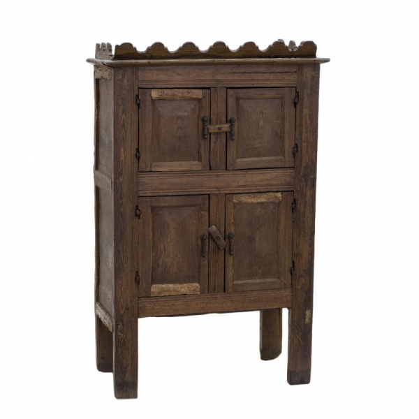 Alacena de estilo castellano popular en madera tallada, posiblemente de pino. Herrajes en hierro recortado. Con armario en parte superior e inferior. S. XVII o posterior.