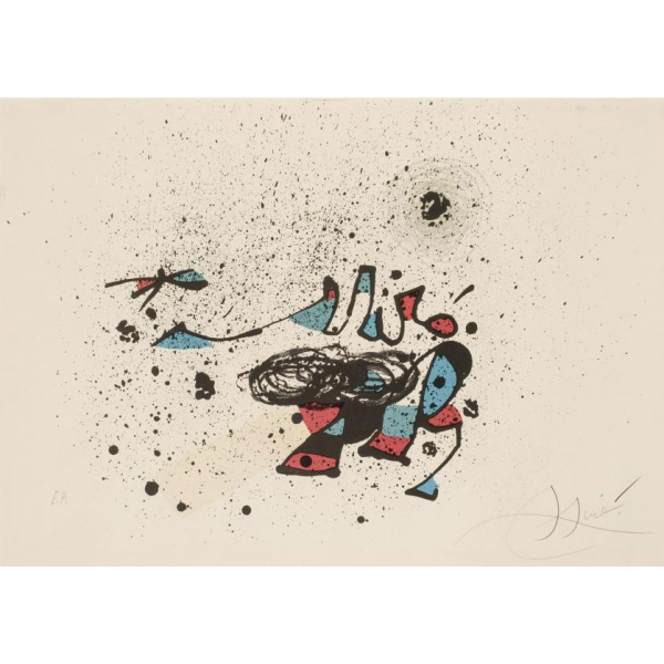 "Miró Maeght (1978)". Litografía sobre papel Aches. Firmado en el ángulo inferior derecho. Numerado (E. A - Epreuve d'Artiste) en el ángulo inferior izquierdo. Obra con pérdida de color.