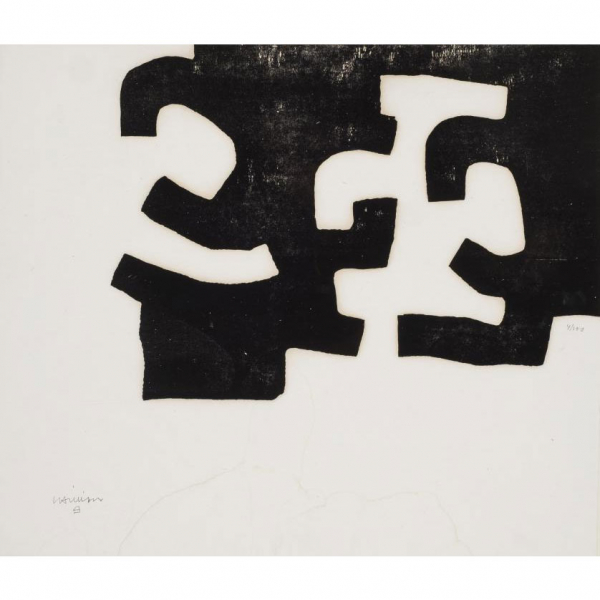 Eduardo Chillida. "Homenaje a Joan Prats (1975)". Xilografía sobre papel China. Firmado en el ángulo inferior izquierdo. Numerado (4/100) en el ángulo inferior derecho. Adherido a cartón. Resto de humedad en la parte inferior.