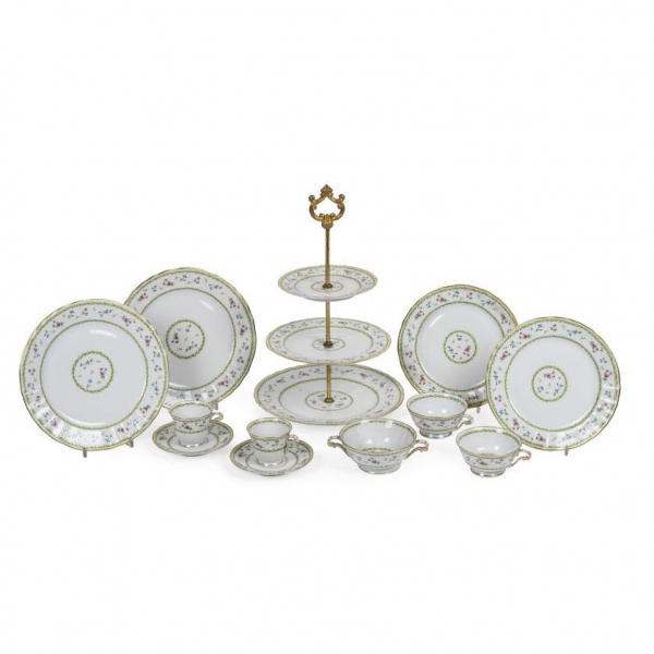 Gran conjunto de vajilla en porcelana francesa esmaltada, vidriada y dorada de Limoges, modelo Artois, decorada siguiendo el modelo de la del Conde d''Artois, S. XVIII. Comercializada por L. Bernardaud & Co, de Limoges.