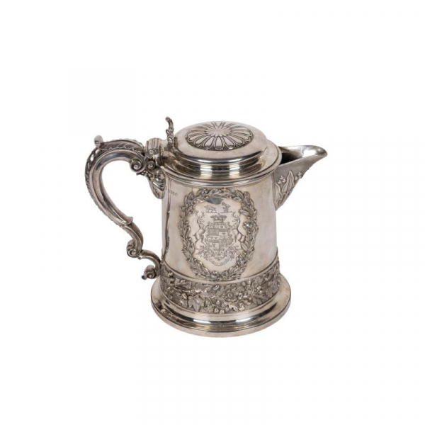 Bonita decoración repujada y cincelada. En el depósito reserva con Baco niño en un lateral, y al otro escudo de armas de la famosa familia Guiness bajo el lema "Spes mea in deo". Parte inferior con cenefa de hojas de vid, roble y bellotas. Asa de acanto y tapa abatile. Inglaterra, circa 1826. Peso: 2.008 gr. 23 cm de alto.
