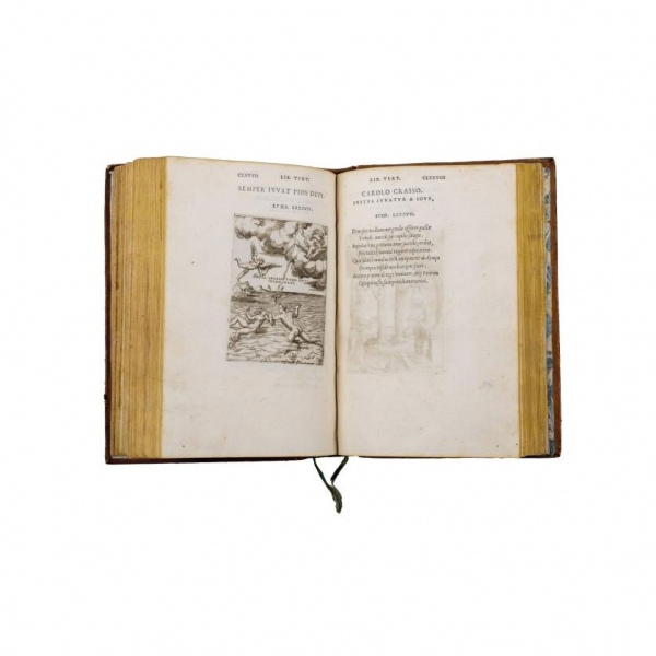 4º menor, pasta con hierros y tejuelo en la lomera (Puntos de polilla en la bisagra, sin afectar al interior) Cortes pintados. Tipos itálicos, romanos y griegos. Abundantes grabados calcográficos. Mínimo punto de polilla afectando al margen ext. de muy pocas pgs. Primera edición del libro de emblemas autoeditado de Bocchi, que contiene grabados en cobre de Giulio Bonasone a partir de diseños de Prospero Fontana y quizás de Parmigianino. Muy raro.