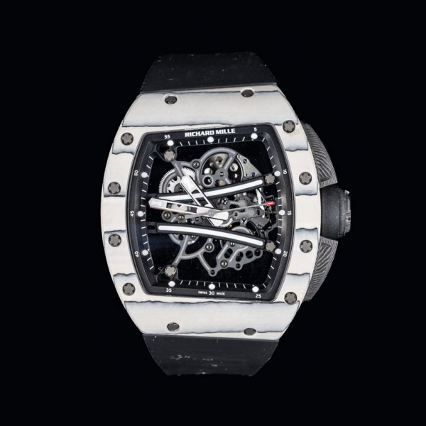 marca RICHARD MILLE, modelo RM61-01, Ultimate Edition, edición conmemorativa del atleta Yohan Blake. Caja tonneau asimétrica de sus predecesores fabricada en Quartz TPT y Carbon TPT para el bisel y el fondo de la caja, este último material también aparece en la carrura. Las múltiples capas de Quartz TPT a base de sílice se entrelazan con capas de Carbon TPT y se calientan a 120° bajo una presión de 6 bares. El material formado por un total de 600 capas, después del fresado y el torneado, revelan unos patrones bandeados aleatorios que hacen que cada pieza sea única.