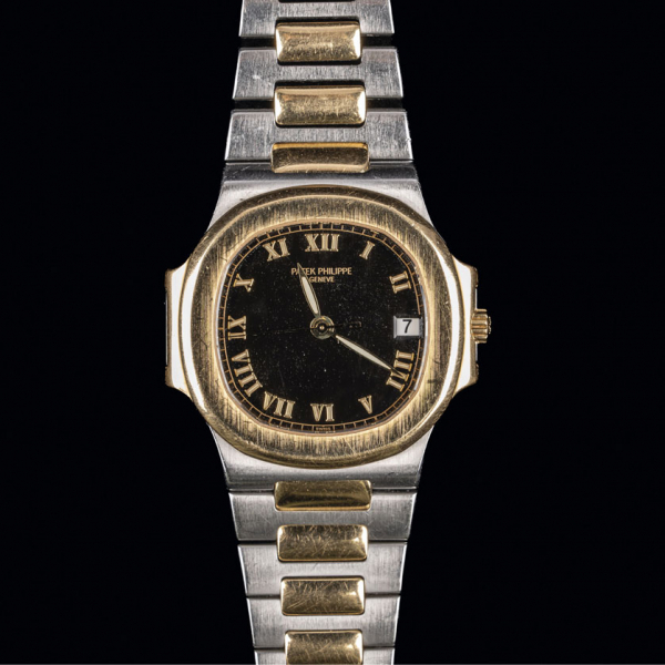 Movimiento automático en estado de marcha. Esfera negra con numeración romana. Calendario a las tres. Numerado: 3022932/4018557. Fondo de acero grabado con iniciales. Brazalete deteriorado. Sin documentación. Con caja del servicio técnico de Patek Philippe. Con estuche.