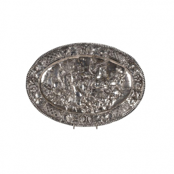 Bandeja decorativa oval de plata punzonada de B. López, España, circa 1900.