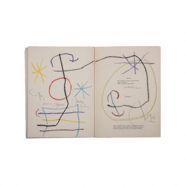 4º, ej. en rama, cub., estuche de petaca. Textos de Joan Brossa, Juan Eduardo Cirlot, Joan Perucho, etc. Cub. litográfica y litografías interiores de Joan Miró, a toda y doble plana. Ej. sin numerar de tirada limitada, con dedicatoria autógrafa a lápiz de Miró a Anna María y Gustau Gili, con dibujo realizado a ceras, a doble plana, en la justificación de tirada.