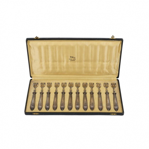 Sofisticado juego Belle Epoque de 12 tenedores para ostras. Mangos bañados en plata, con decoración de acantos. Francia. Pps. S. XX.