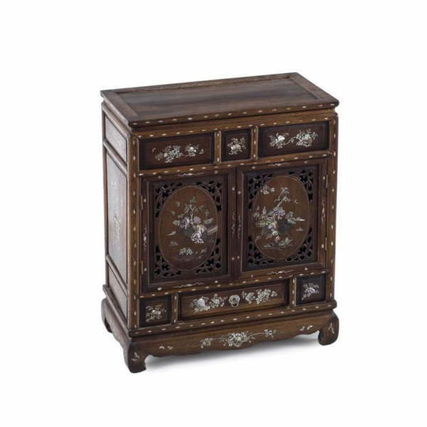 Cabinet chino en miniatura realizado en madera tallada con incrustaciones de nácar. S. XIX.