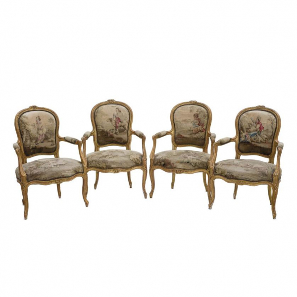 Cuatro sillas de brazos Luis XV en madera tallada y dorada al pan de oro. Tapicería Abusson. S. XVIII - XIX.