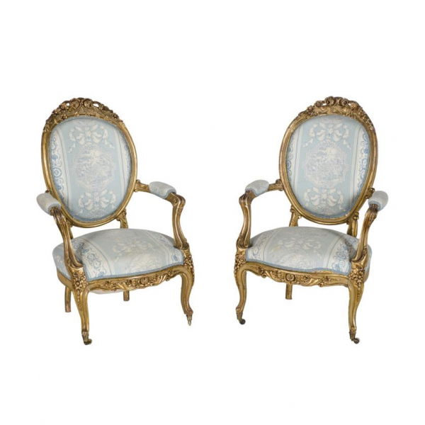 Pareja de grandes butacones isabelinos realizados en madera tallada y dorada. S. XIX.