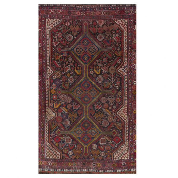Alfombra oriental caucásica realizada en lana. Decoración vegetal esquematizada de cariz geométrico. S. XX.