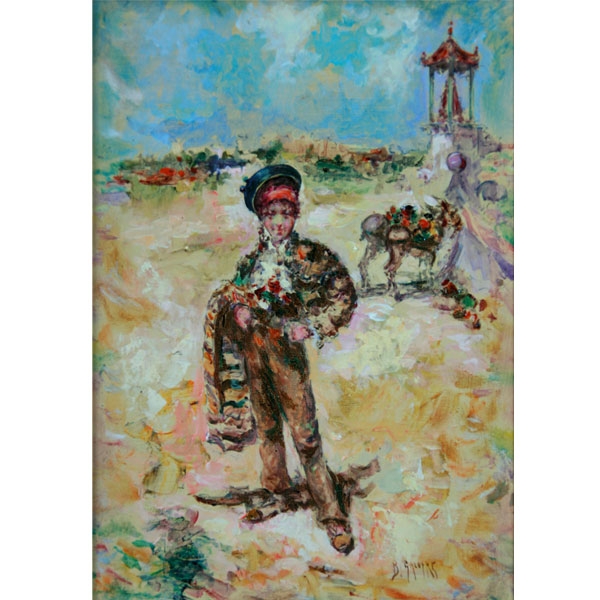 GALOFRE GIMÉNEZ, Baldomero - Reus, 1849 – Barcelona 1902 - Durante su primera juventud, Baldomero Galofre fue discípulo del célebre pintor y maestro Ramón Martí Alsina, autor de paisajes y de pintura de historia influido por Courbet y la escuela de Barbizon, cuyo realismo teñido de intimidad familiar fue transmitiendo a su más adelantado discípulo, uno de los más destacados representantes del costumbrismo catalán como demostrará en sucesivas exposiciones en Barcelona –en 1866, 1870 y 1872- y en Zaragoza –en 1868-. Ya desde 1870 era ilustrador de la revista “La Ilustración Española y Americana”, y en 1874 Galofre fue pensionado en la Academia Española de Bellas Artes en Roma el mismo año que fallecía allí Fortuny y exponían en París por primera vez los impresionistas franceses en el salón des “Refusés” , permaneciendo en la ciudad hasta 1884. Posteriormente pasó en ella largas temporadas a lo largo de su vida. Durante su primera estancia allí se convirtió en uno de los más fieles seguidores de Mariano Fortuny, cuya brillante luminosidad adoptaría en sus tablitas y lienzos, continuando en la nueva percepción que del paisaje le había inculcado su primer maestro, Martí Alsina. Baldomero Galofre conseguiría abrazar entonces sus máximos momentos de gloria mediante su singular propuesta de corte naturalista que como veremos, ocupó generacionalmente un lugar de transición tanto en el espacio como en el tiempo que le tocó vivir. A su vuelta a España ideó una obra monumental que proyectaba publicar bajo el título de “ La España Pintoresca” para la cual trabajó con denuedo en gran cantidad de bocetos y estudios que recopilaba durante sus viajes por el país. A las escenas de género sumaba, entonces, una destacada pintura de paisajes y marinas de gran calidad y una gran cantidad de acuarelas y pasteles, técnicas en las que demostró gran pericia y buen hacer. Sus obras eran de paleta alegre, intensa y de tonos vivaces, a la par suaves y elegantes. El proyecto, que había incubado en Italia y que comenzó a su vuelta en 1887, era de tales proporciones que no pudo materializarse en el transcurso de toda su vida que pretendía, entre otras cosas, acabar con la visión romántica y falsaria que habían difundido por Europa los viajeros extranjeros, como Teófilo Gautier a Gustavo Doré, recogiendo en particular la diversidad regional y típica de las provincias españolas y diferenciando en cada una de ellas lo que de auténtico y real tenían su historia y sus tradiciones. El resto de su vida transcurrió entre Barcelona, (ciudad en que se había instalado definitivamente desde 1886) entre sus distintos viajes a Italia y Londres. Murió el 26 de julio de 1902, y en ese mismo año, el marchante Josep Artal organizó una exposición antológica homenaje en Buenos Aires.