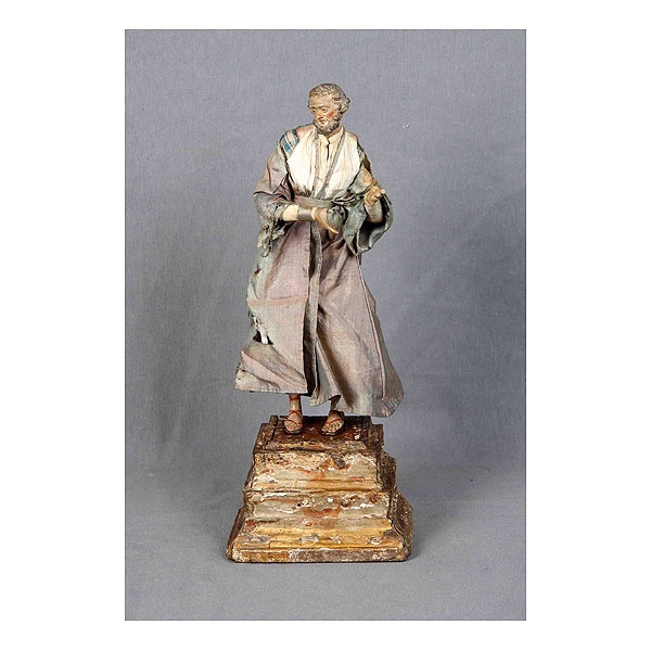 Antigua figura de Belén napolitano, S.XVIII, en terracota y tela, sobre peana de madera con restos de dorado. Alt.: 34 cm. (Estado de conversación: con desperfectos).