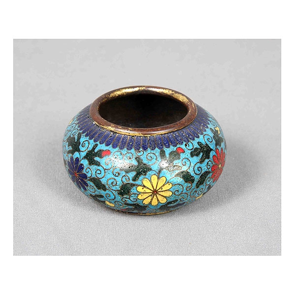 Incensario chino en bronce dorado, S.XVIII-XIX, decorado con esmalte cloisonné con motivos florales y vegetales. Boca con restos de dorado. Marcas en la base. Alt.: 6 cm.