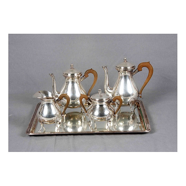 Juego de café y té en plata punzonada, formado por bandeja, tetera, cafetera, y jarrita de leche. Med. bandeja: 46,5x35,5 cm. Alt. recipientes: 23,5 cm. aprox. Peso bandeja: 1.852 gr. Peso recipientes: 2.249 gr.
