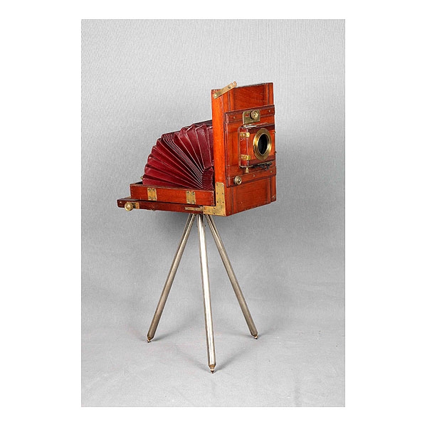 Cámara réflex de fuelle francesa, años 1900-1920, latón y madera de caoba, con trípode cromado. La cámara muestra diversas marcas, algunas en el objetivo. Con su maletín. Med.: 50x25,5x20 cm. aprox.