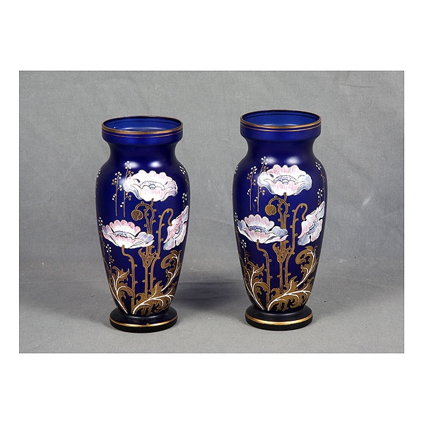 Pareja de jarrones modernistas, años 20-40, en cristal azul con decoración de motivos florales realizada a mano. Alt.: 26 cm.
