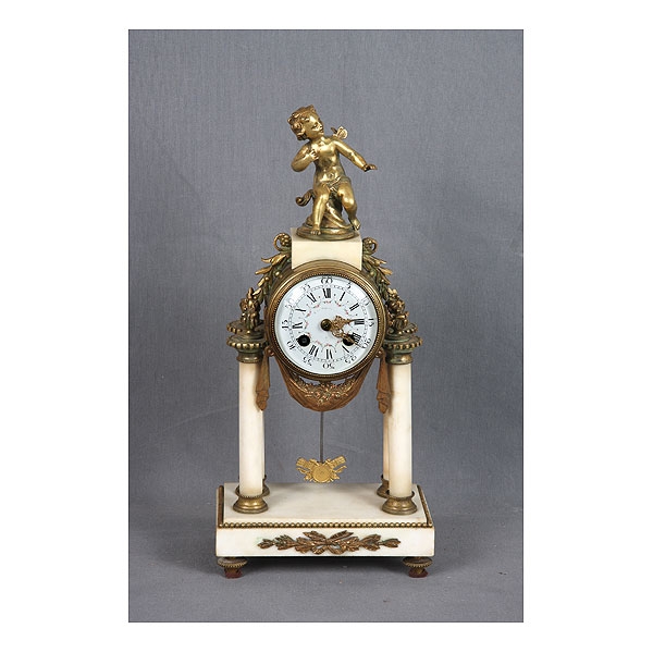 Reloj Luis XVI, Francia 1890-1900, realizado en mármol blanco y bronce. Esfera esmaltada, de numeración romana. Con llave y péndulo. Med.: 41x19x11 cm.