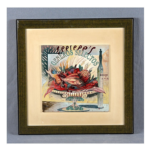 CEESEPE, CARLOS (1958). “Géneros selectos”. Óleo sobre cartón, de 25,5x25,5 cm. Fechado 21-11-96 y firmado.