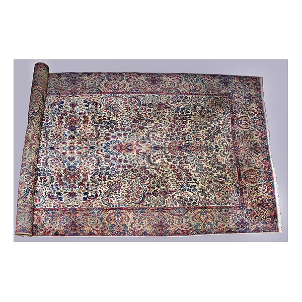 Alfombra ROYAL KERMAN, en lana con trama en algodón, procedente de Persia, mediados S.XX. Tejido excepcionalmente fino y diseño decorativo en base a un jardín de flores, que incluye jazmines, hojas coloridas y palmitos. Tintes 100% naturales (azul índigo, azul oscuro, rojo, beige, marrón, y verde sobre fondo crema). Med.: 550x300 cm. En perfecto estado.