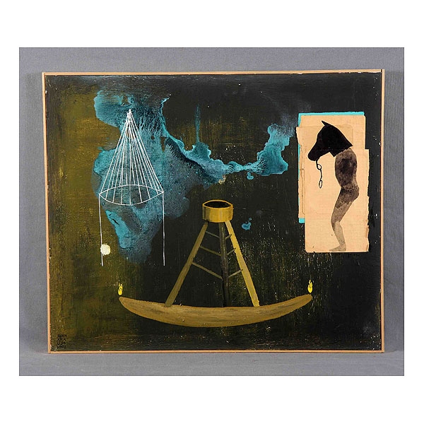 ARAUJO, IVÁN (1971). “Lugares comunes (III)”. Técnica mixta y collage sobre tabla, de 46x55 cm. Firmado y fechado 2002. Al dorso, firmado, titulado y fechado.