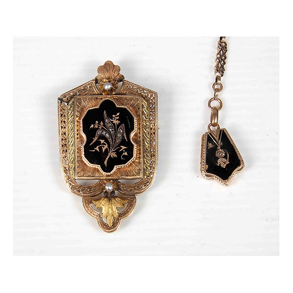 Broche alfiler colgante isabelino, S.XIX, con cadena y guardafotos en miniatura, en oro y esmalte. Decoración de motivos vegetales con diamantes y perlas.