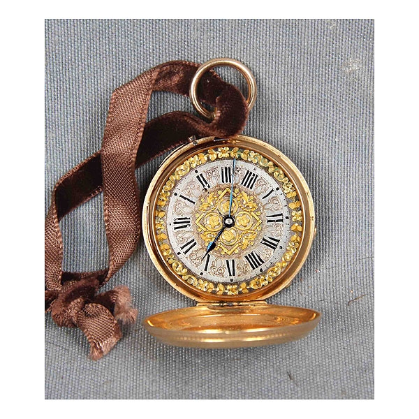 Reloj de bolsillo isabelino, de la marca suiza G.A. HUGUENIN & FILS, PONTS MARTEL. Numerado 104748. Circa 1900, en oro 18K y pintado en negro, decoracion de flechas, lazos y motivos florales con diamantitos.