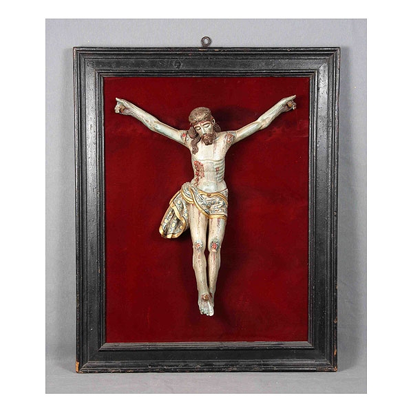 ESC. PORTUGUESA, S.XVII. "Cristo crucificado". Talla en madera policromada. Med.: 58x46 cm. aprox. (Estado de conservación: con algunos desperfectos en las manos).